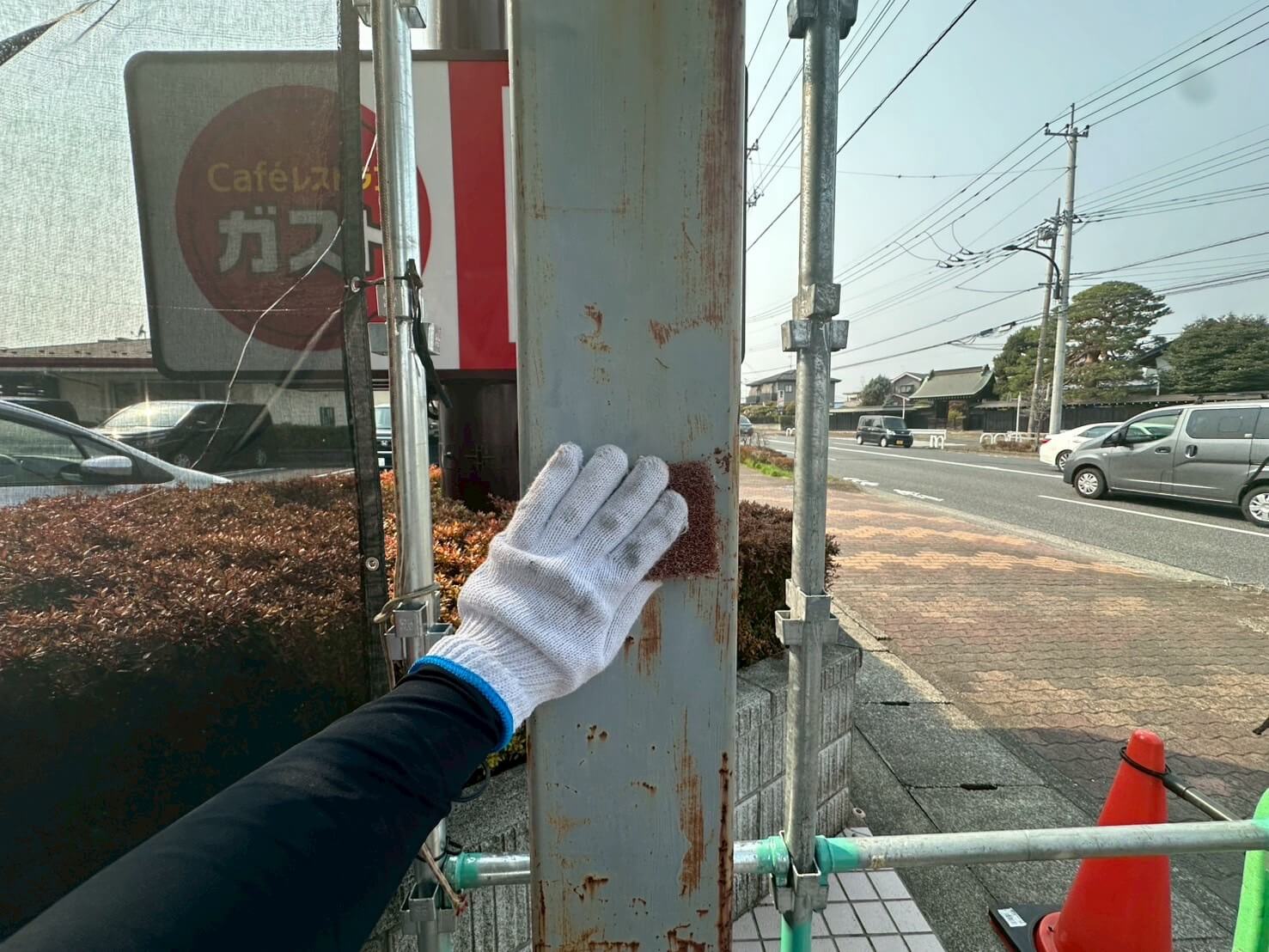 目粗しは、ケレンの程度が最も軽い状態の「ケレン4種」にあたる工程です。塗料の密着性を高めるのが主な目的で、鉄部の表面に細かな傷を付けることにより、塗料の接触面積を広げます。