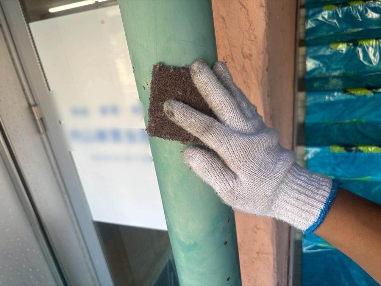 目粗しは、ケレンの程度が最も軽い状態の「ケレン4種」にあたる工程です。塗料の密着性を高めるのが主な目的で、鉄部の表面に細かな傷を付けることにより、塗料の接触面積を広げます。