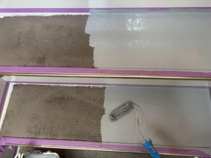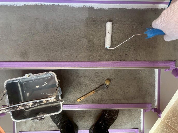 今回は階段の防水工事のため、コンクリート床の美装と防塵を目的とした溶剤アクリル系塗料での施工になります!