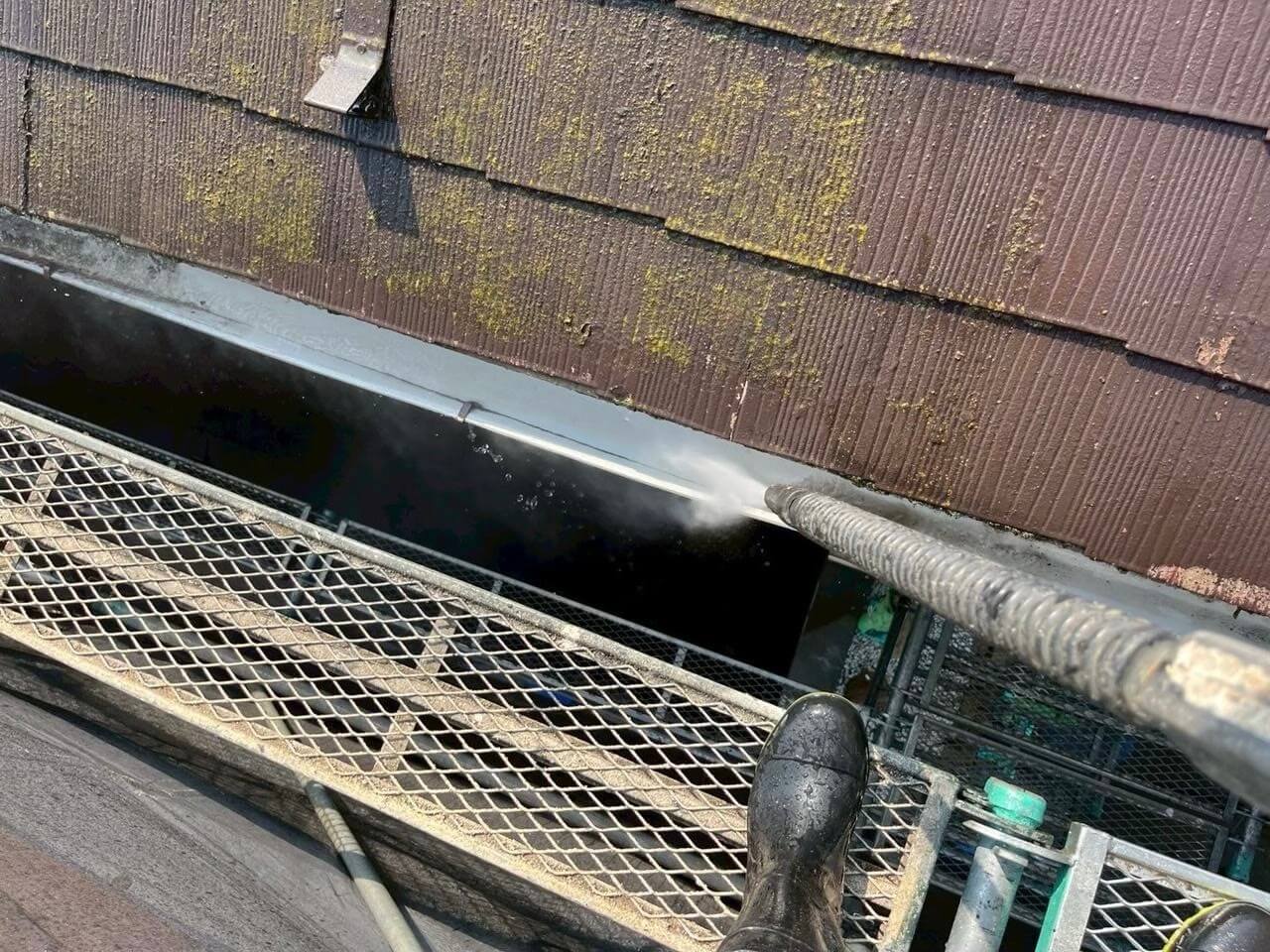外壁塗装工事や屋根塗装工事では、塗装前(塗料を塗る前)に、高圧洗浄機を使用して、高圧の水で外壁に付着した汚れや傷んだ旧塗膜などを洗い流します。