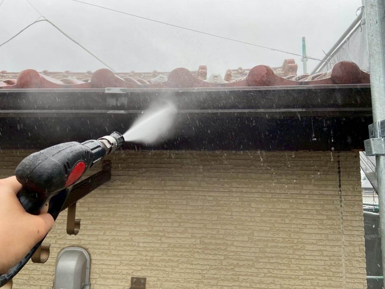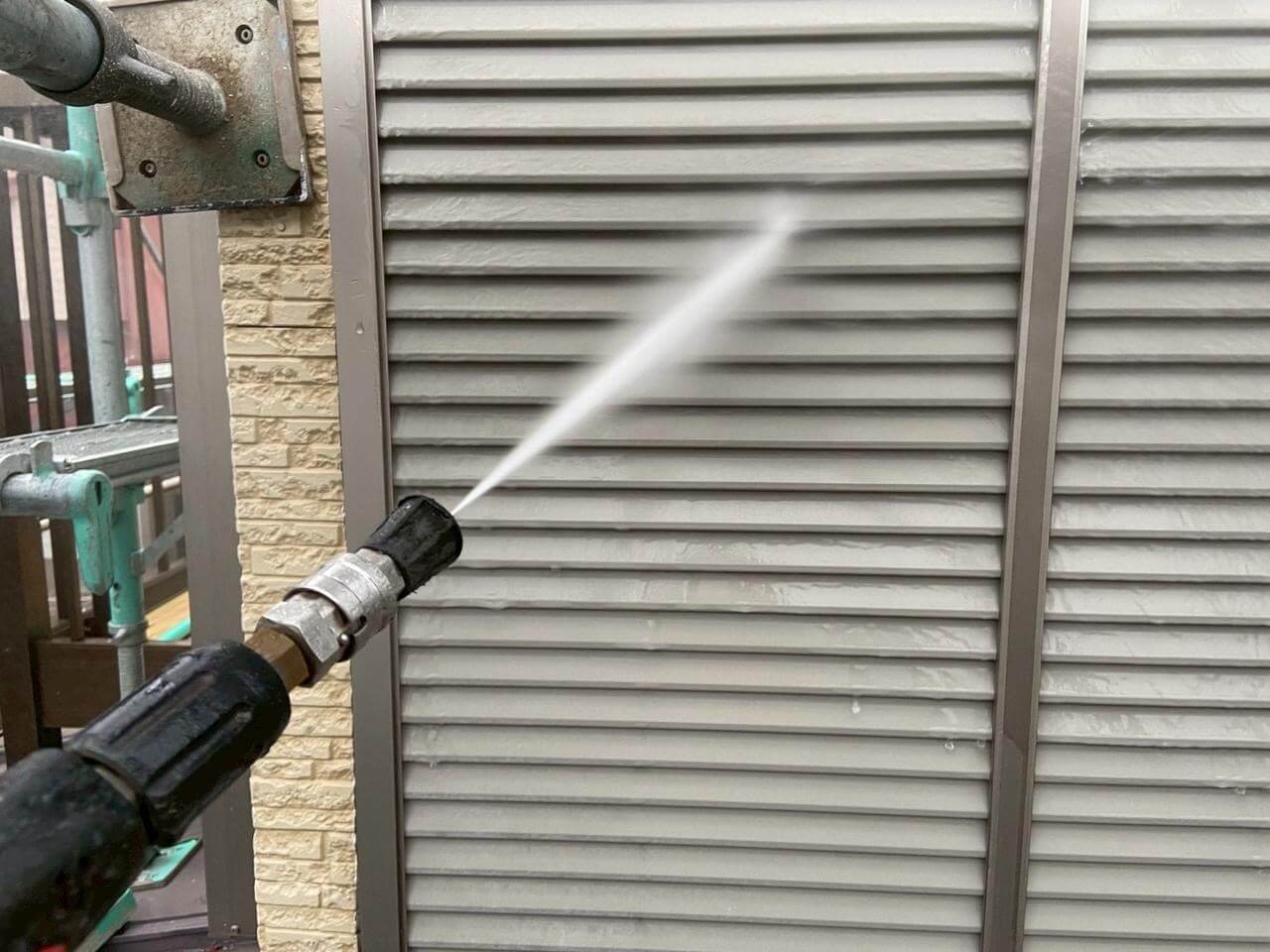 外壁塗装工事や屋根塗装工事では、塗装前(塗料を塗る前)に、高圧洗浄機を使用して、高圧の水で外壁に付着した汚れや傷んだ旧塗膜などを洗い流します。