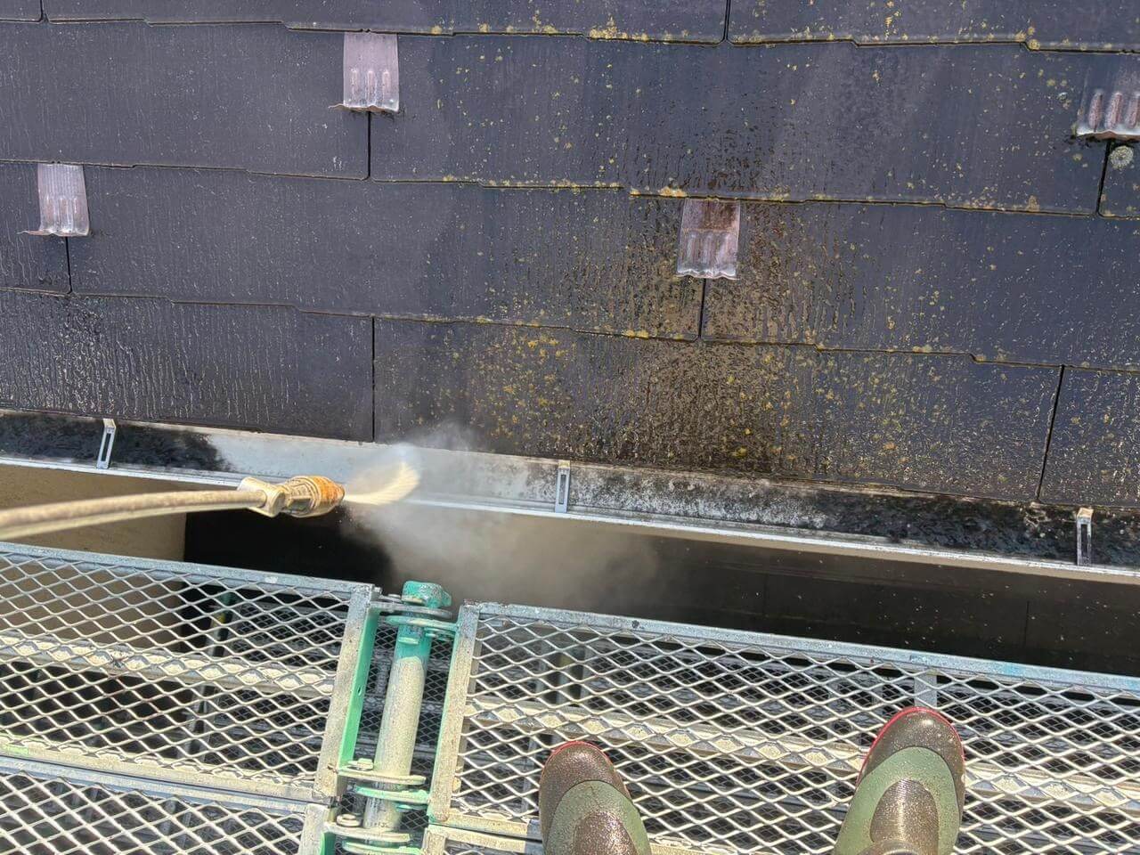 足場が建ったらお家の頭と言われる部分から高圧洗浄の方を進めていきます。