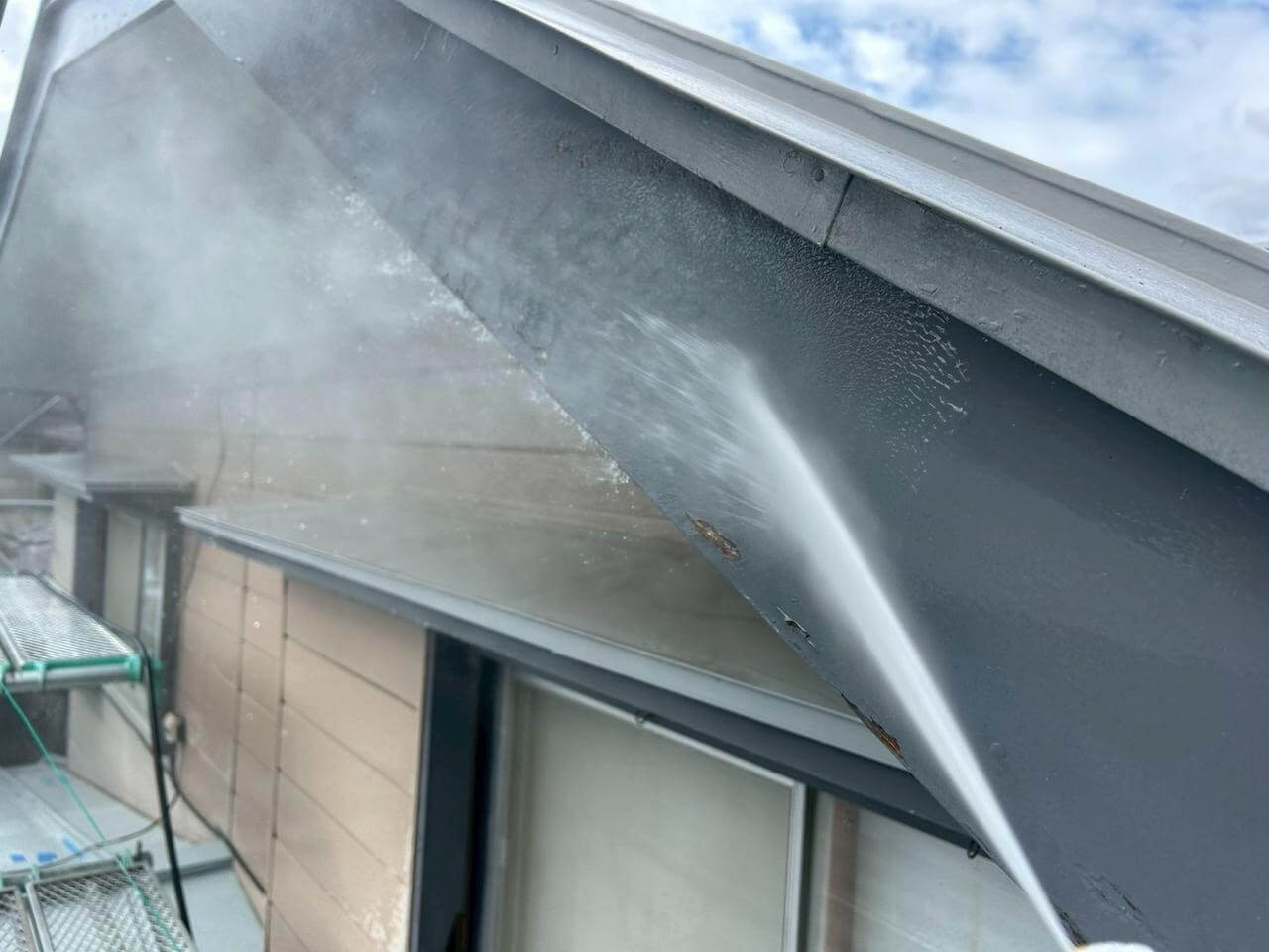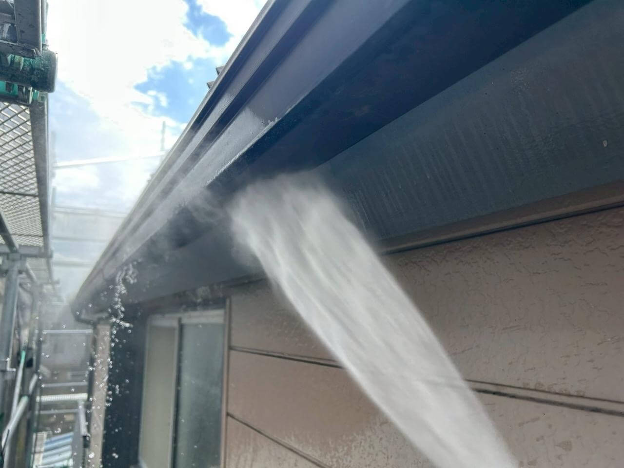 外壁塗装工事屋根塗装工事では、塗装前(塗料を塗る前)に、高圧洗浄機を使用して、高圧の水で外壁に付着した汚れや傷んだ旧塗膜などを洗い流します。