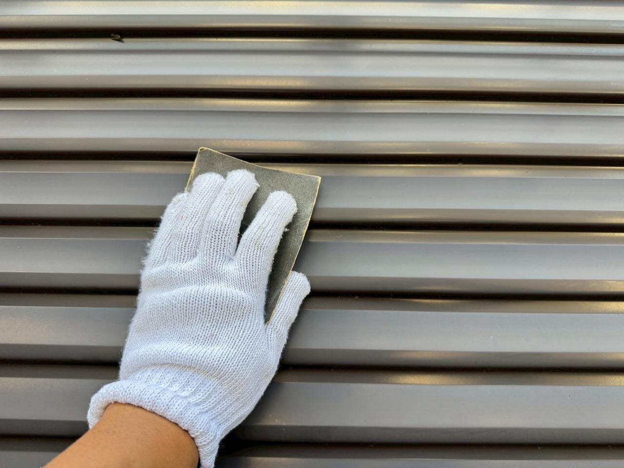 目粗しは、ケレンの程度が最も軽い状態の「ケレン4種」にあたる工程です。塗料の密着性を高めるのが主な目的で、鉄部の表面に細かな傷を付けることにより、塗料の接触面積を広げます。
