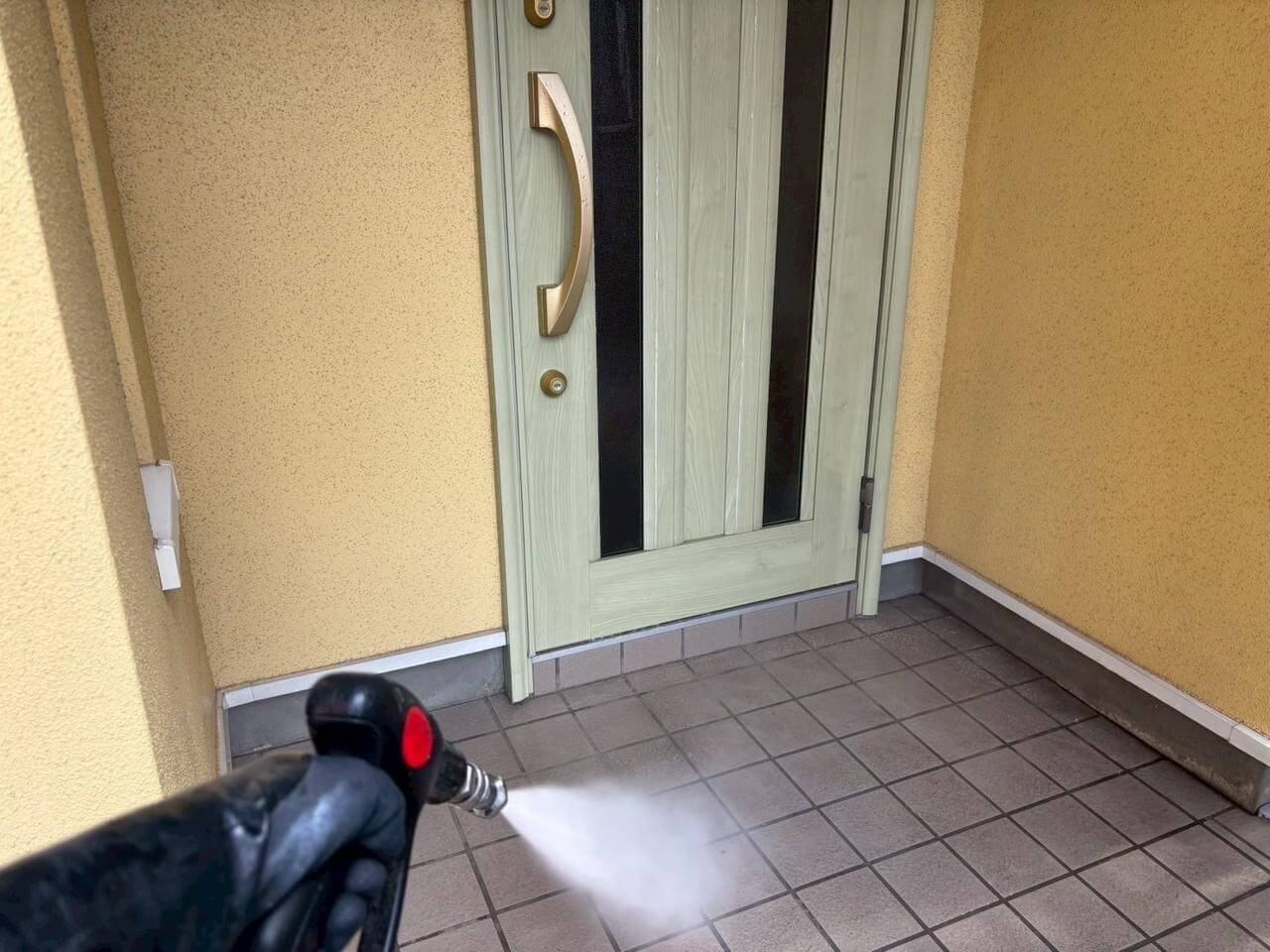 毎日出入りしている玄関も綺麗に洗い流します。また、基礎の部分はよく泥や苔などがついているため、しっかりと洗い流します。