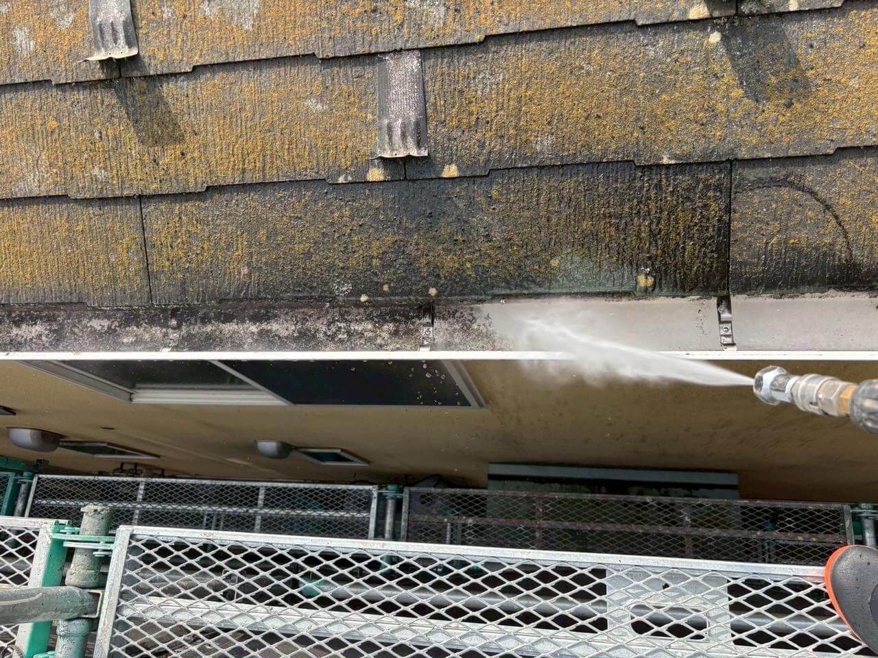 足場が建ったらお家の頭と言われる部分から高圧洗浄の方を進めていきます。