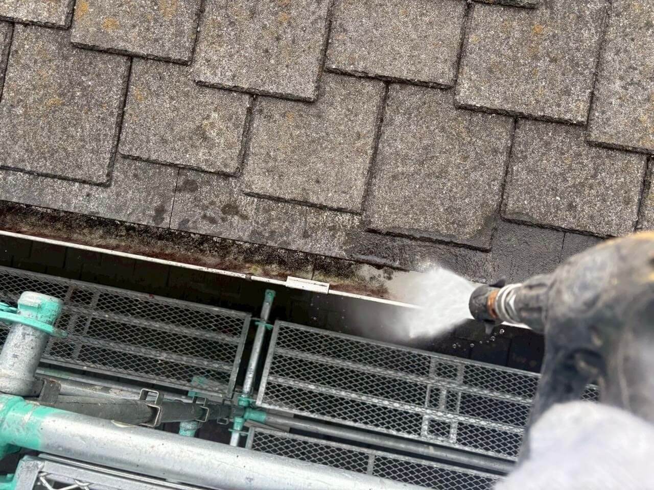 外壁塗装工事や屋根塗装工事では、塗装前(塗料を塗る前)に、高圧洗浄機を使用して、高圧の水で外壁に付着した汚れや傷んだ旧塗膜などを洗い流します。