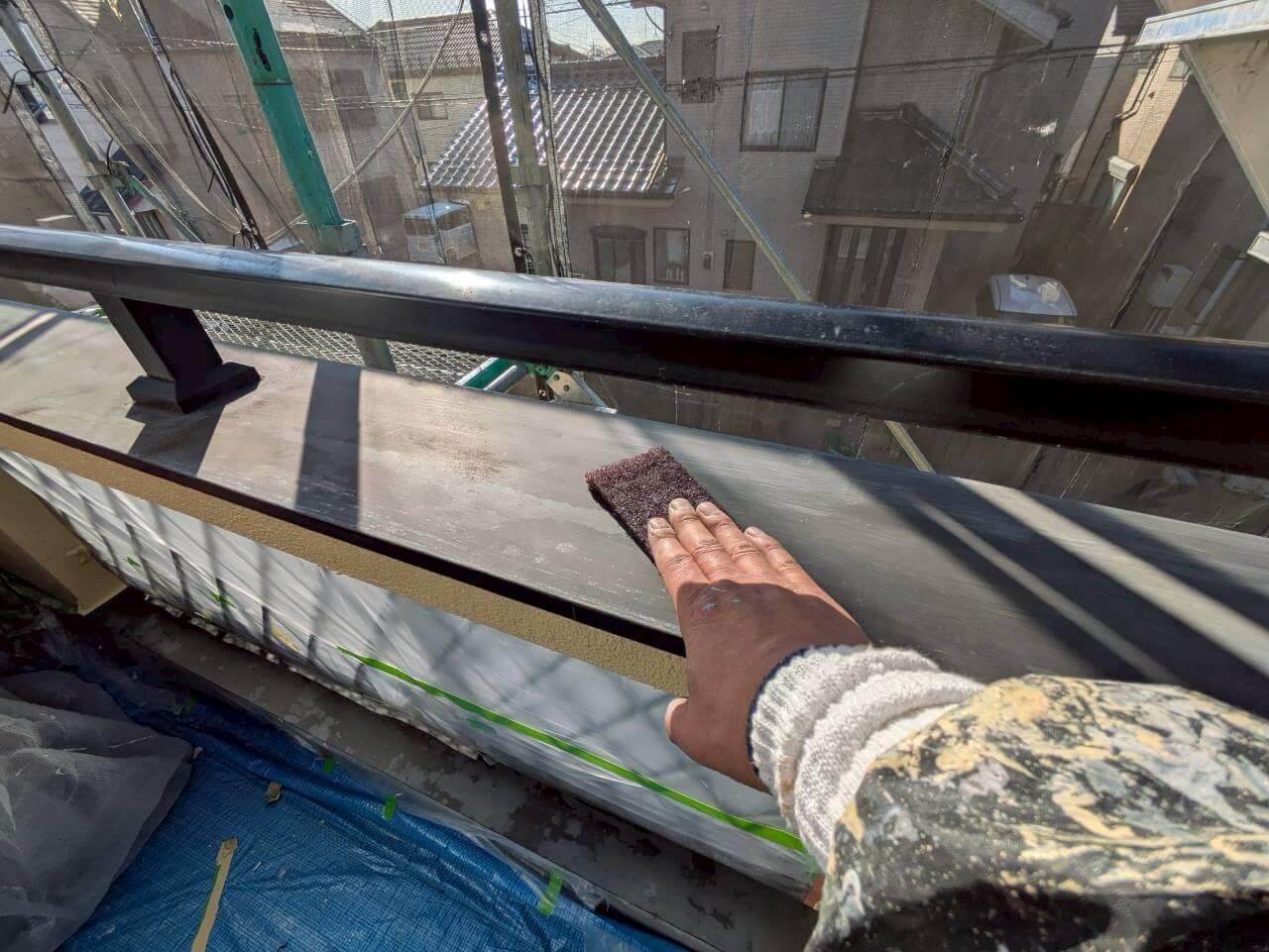 目粗しは、ケレンの程度が最も軽い状態の「ケレン4種」にあたる工程です。塗料の密着性を高めるのが主な目的で、鉄部の表面に細かな傷を付けることにより、塗料の接触面積を広げます。