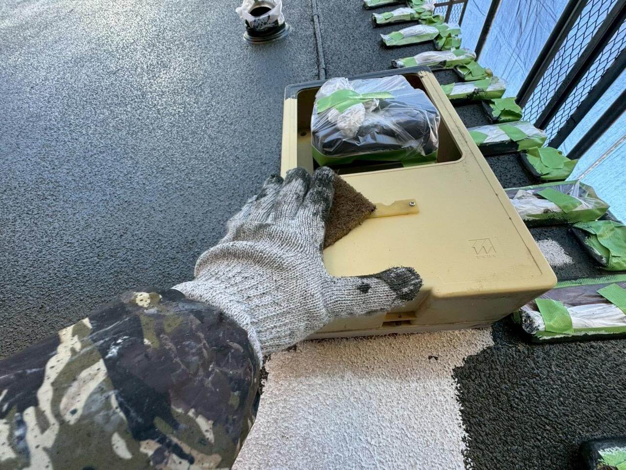 目粗しは、ケレンの程度が最も軽い状態の「ケレン4種」にあたる工程です。塗料の密着性を高めるのが主な目的で、電気メーターBOXの表面に細かな傷を付けることにより、塗料の接触面積を広げます。