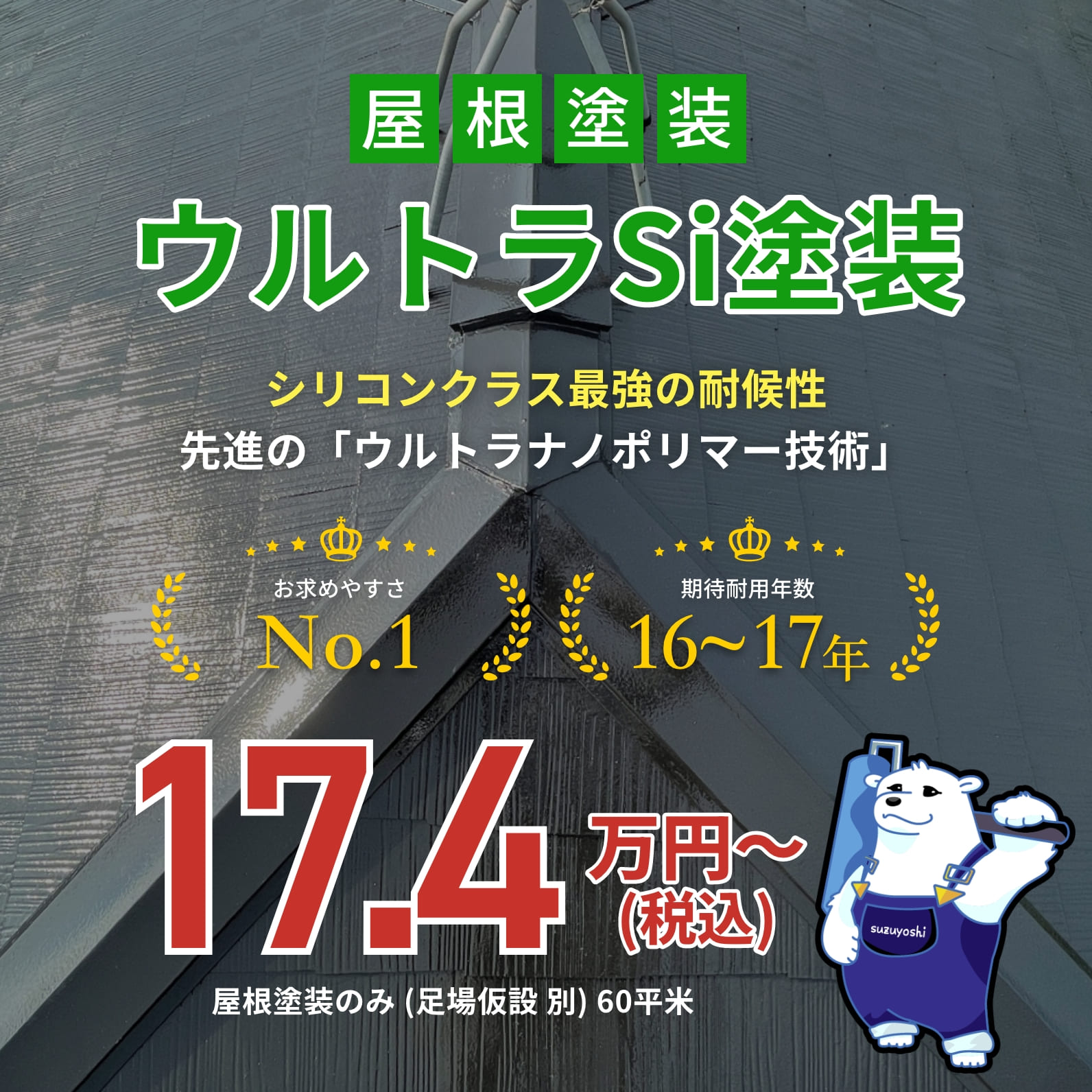 ウルトラナノポリマー技術による緻密で強靭な塗膜は、従来の1液水性塗料では対応できなかった屋根塗装を可能にし、2液弱溶剤以上の耐候性を発揮します。